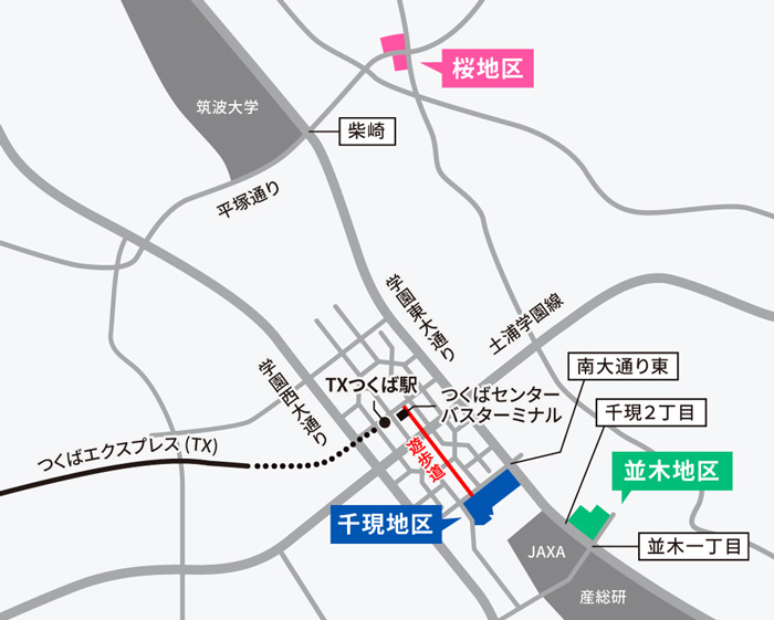 A3出口より、遊歩道「つくば公園通り」を歩いて約15分。