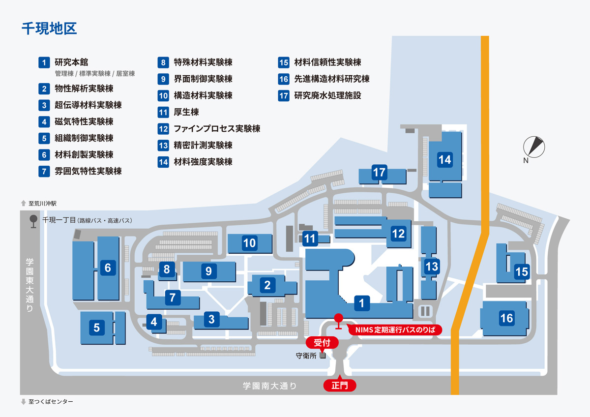 茨城県つくば市のつくば駅(つくばセンター)から徒歩15分の場所に位置する千現地区には、NIMSの本部機能が置かれています。