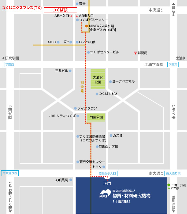 「大角豆(ささぎ)」交差点を右折し、学園東大通りを約3キロ直進。「南大通り東」交差点を左折し、1つ目の「竹園西小入口」交差点を左折 (NIMS正門)。