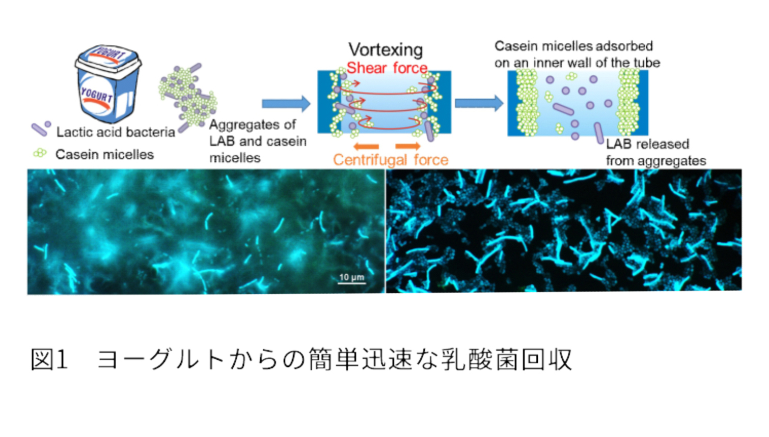 Yogurt contains large aggregates of casein micelles that coexist with lactic acid bacteria during fermentation, hindering the recovery of lactic acid bacteria through centrifugation or dilution. A newly developed method enables the preparation of a lactic acid bacteria aqueous solution with casein micelles removed in approximately 5–10 minutes (Figure 1).