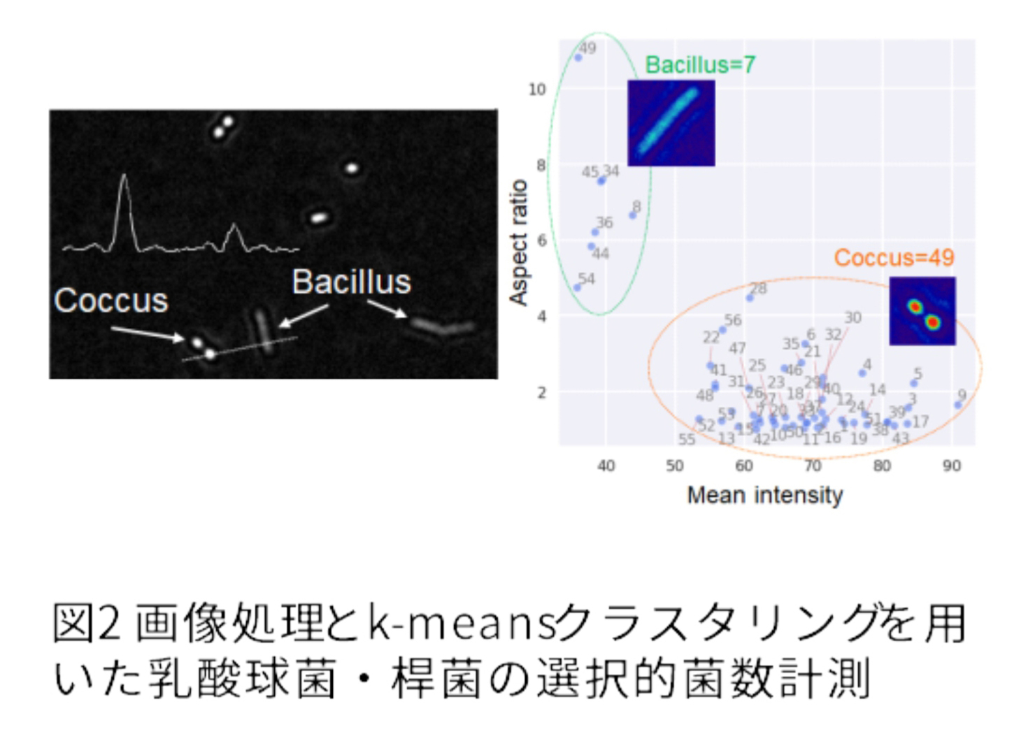 When 2 μL of this solution is placed on a cover glass and allowed to dry, cocci and bacilli can be clearly observed under a microscope. Image analysis of the microscope images and k-means clustering enabled selective bacterial count measurement of lactobacilli and bacilli within the images (Figure 2).
