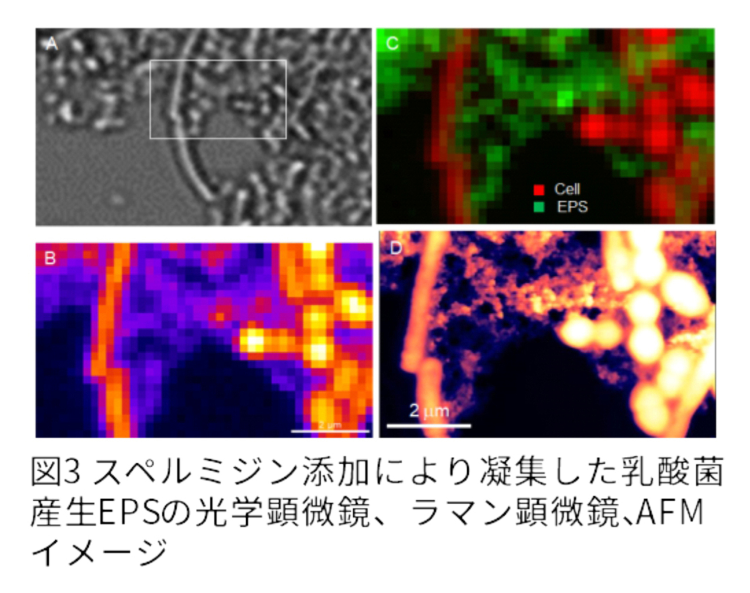 This allowed visualization of the EPS produced by individual lactic acid bacteria at the optical microscope level, and image analysis enabled quantification of the produced EPS. Moving forward, we aim to standardize this protocol by applying this technology to routine yogurt quality control and screening for lactic acid bacteria that produce useful EPS.
