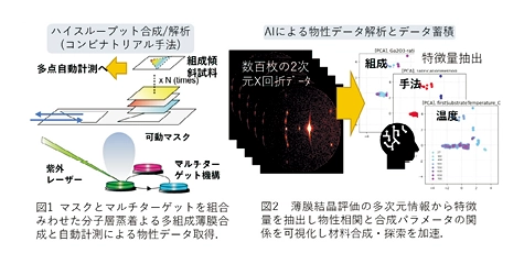 スマートラボでは、これまで開発した高速薄膜材料合成技術であるコンビナトリアル材料合成・評価技術(図1)に加えて、多量点解析・データベース化・計算科学のマテリアルズ・インフォマティクス(MI)の導入(図2)を進め、更なる材料開発の加速を行っている。