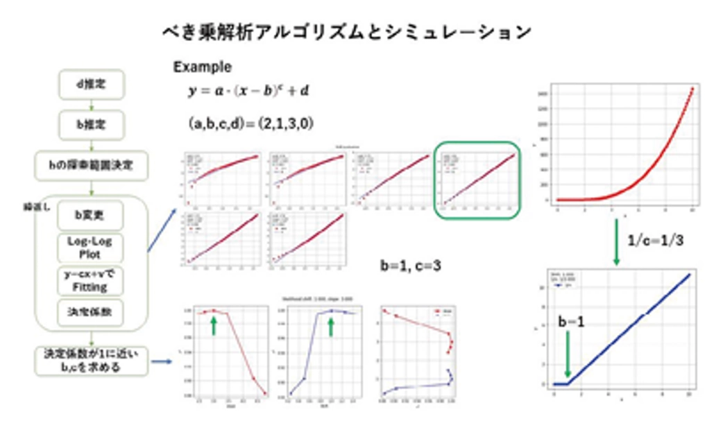 図はべき乗数及び閾値を推定するアルゴリズムとそのシミュレーションを示す。べき乗スペクトルは両対数プロットで解析が行われるが、閾値が移動すると単純に両対数を取ると適切なべき乗数を推定することができない。そこで、移動量も加味したプロットに直すことで推定することができる。