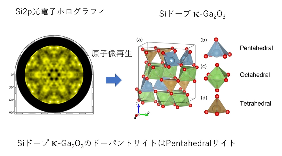 Siドープしたk-Ga2O3のユニットセル中には3種類のGaサイトが存在するが、ドーパントとしてどのGaサイトにSiが入るかわかっていない。光電子ホログラフィ法の原子像再生によりドーパントSiの置換サイトはトリゴナルサイトであることがわかった。