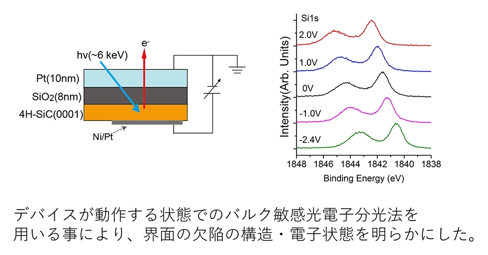 - 本手法はSiC、GaN、Ga2O3に既に展開している。Pt/SiO2/4H-SiCデバイスが動作する状態でのバルク敏感光電子分光法により、基板から界面への電子のやりとりを調べた。また、理論計算を併用することにより、界面の欠陥の構造・電子状態を明らかにした。