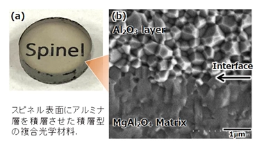 例えば、左図は赤外透過材料として知られるMgAl2O4スピネル表面に高硬度のα-Al2O3アルミナ相を積層させることで、優れた広帯域透過特性を維持しつつ、従来比2.0-2.5倍の機械的特性(高硬度)を重畳する高強度・広帯域透過特性を有する積層型の光学CMC材料を実現した。合成プロセスを最適化し、良好な接合界面を達成することで積層型の光学材料の実現に至った。