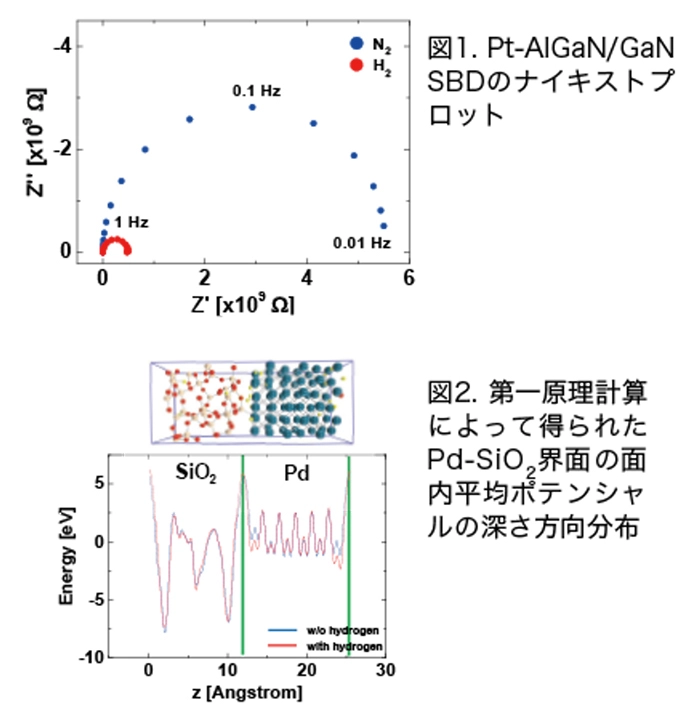 図2より、水素吸着前後で面内平均ポテンシャルに大きな変化が見られない。以上の結果より、界面において水素が電気二重層を形成することは考えにくい。次に、Pt-GaNショットキーダイオードの電極と半導体界面に様々な絶縁膜を挿入して水素応答を調べた。その結果、挿入する絶縁膜の種類によって、水素応答が大きく変化することがわかった。
