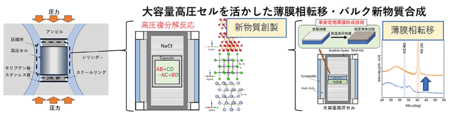 ベルト型高圧装置を用いることで、大容量のセル内を約8万気圧、2400℃程度まで高温・高圧環境にすることが出来る。セル内で化学反応(特に複分解反応)を進行させることで、多種多様な新物質の創製が可能である。これまでに本手法を用いて、新規窒化物半導体や硬質材料、超伝導物質を合成している。さらに、最近では大容量セルという利点を生かして、薄膜新材料の開発を実施している。