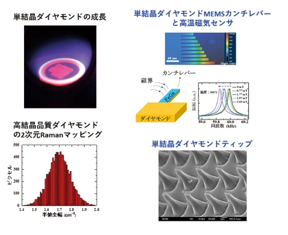 - 世界で初めて電気信号で駆動する単結晶ダイヤモンドMEMSチップの開発に成功した。単結晶ダイヤモンドMEMSチップを実際に動作させたところ、高感度、低動作電圧、高温動作(600℃)などにおいて優れた特性を示した。