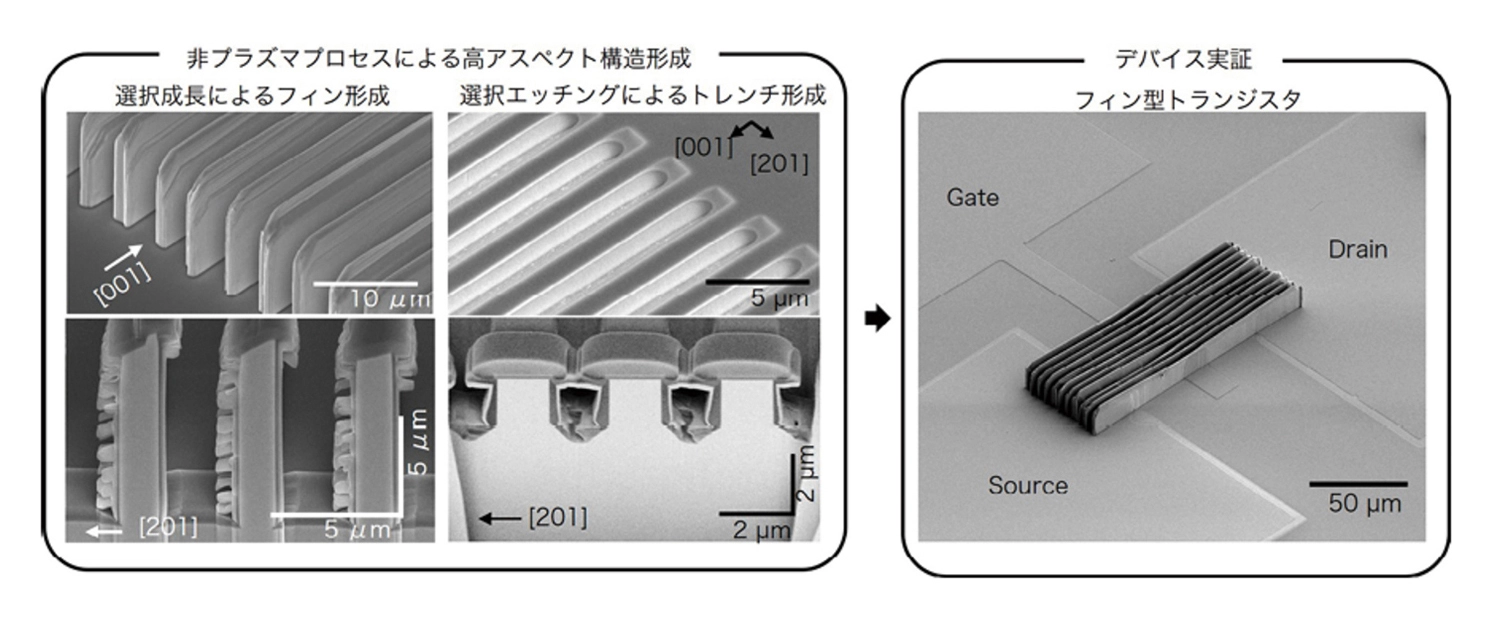 本研究では、その課題を解決可能な新しい加工方法として、選択成長と選択ガスエッチングを実演した。これらの手法では、化学的に最安定な結晶ファセットを側壁面として顕在化させることで、反応性をイオンを用いずに、図に示すようなフィンやトレンチ構造を作製可能である。