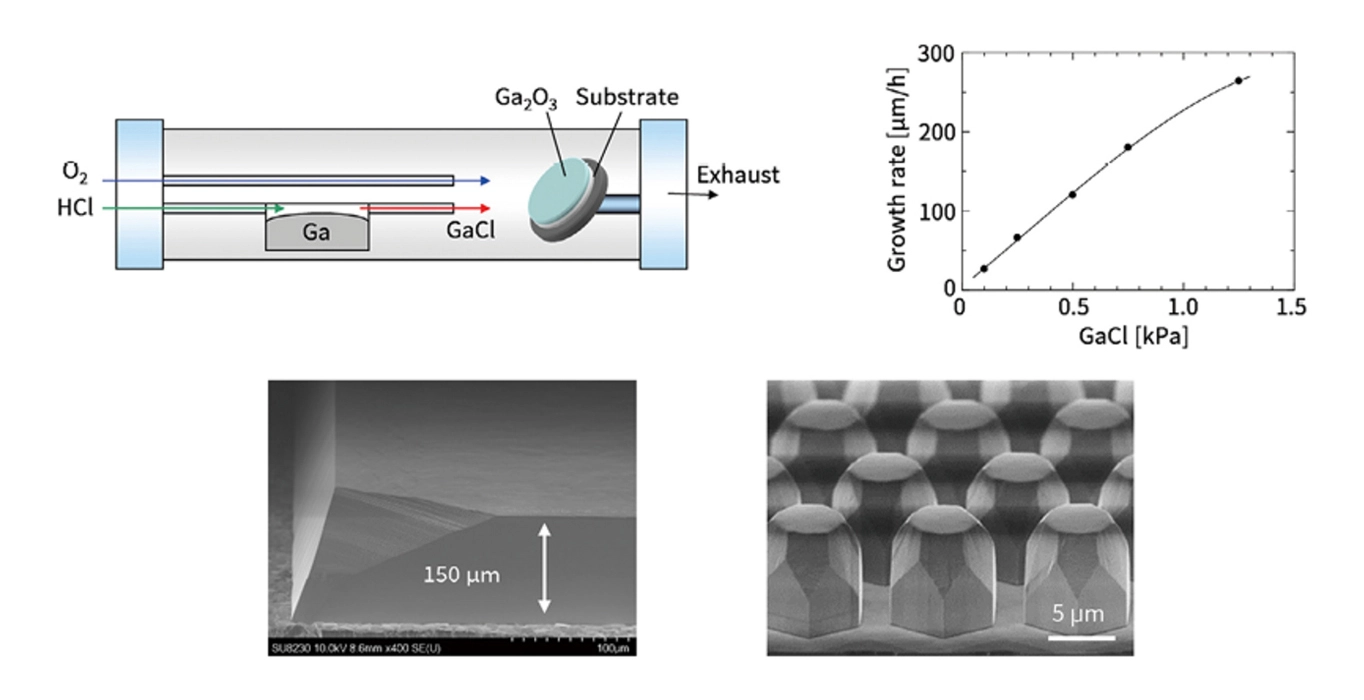 GaNなどのIII-V族化合物半導体の高速成膜で実績のあるHVPE法を、UWBG半導体として注目されているGa2O3の成長に展開し、その確立を目指している。これまでに、独自の反応炉設計、および成長反応とエッチング反応のバランス最適化による寄生反応抑制技術により100 µm/hを超える超高速成長を実現し、それを用いて100 µmを超える厚膜を成長することに成功している。また、選択成長と高速成長の両立にも成功し、転位密度の大幅な低減にも成功した。