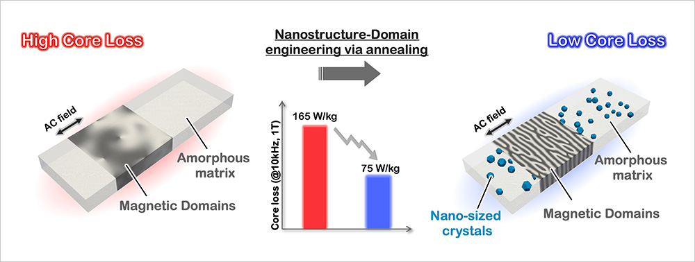 Figure. Schematic diagrams of the nanostructure and magnetic domain structure of a conventional amorphous soft magnetic ribbon (left) and the newly developed ribbon (right). The new material exhibits a controlled nanostructure and magnetic domain structure achieved using optimized thermal treatment. The central graph demonstrates that these structural controls reduce core loss by more than 50%.
