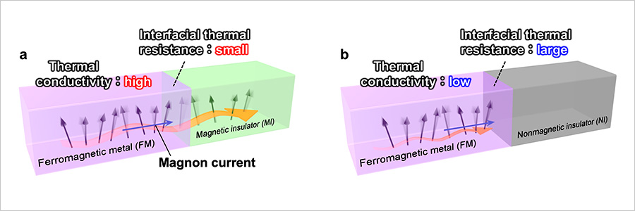 Figure. Schematic of magnon-engineered thermal transport in a ferromagnetic metal / magnetic insulator junction (a) and a ferromagnetic metal / non-magnetic insulator junction (b). When magnons can pass through the interface, the thermal conductivity of the ferromagnetic metal increases and the interfacial thermal resistance decreases compared to when they cannot pass through.