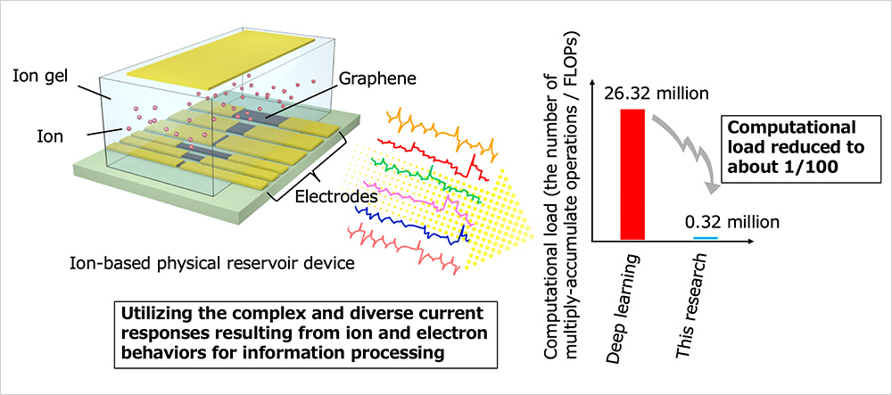 Figure. The ion-based physical reservoir developed in this research (left) and the computational load reduction achieved in a typical benchmark test (right).
