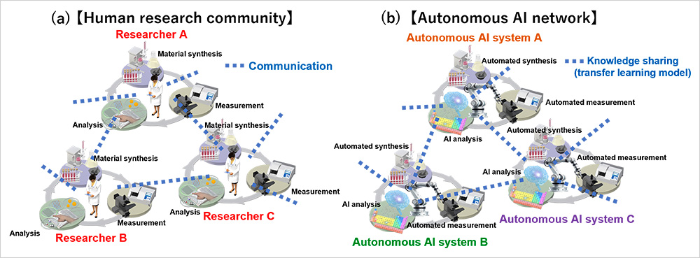 Figure. Comparison between a human research community and an autonomous AI network. (a) Researchers in different fields form a researcher network by sharing extensive knowledge through communication, and advance exploration of new materials. (b) Autonomous AI systems exploring different materials form an autonomous AI network by spontaneously sharing knowledge, and advance exploration of new materials.