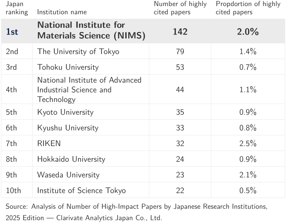 NIMS surpasses other domestic research institutions in the number of papers cited! We are ranked No. 1 for domestic influence in materials science.