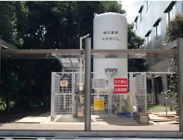 NIMSは、実験・研究用として多様な高圧ガスを使用しています。最も多く使用している高圧ガスは、アルゴンガス、酸素ガス、窒素ガスなどです。その他、液体窒素、液体ヘリウムを実験機器等の冷却に用いています。これらのガスは大気に放出されても無害であり、環境への負荷はありません。