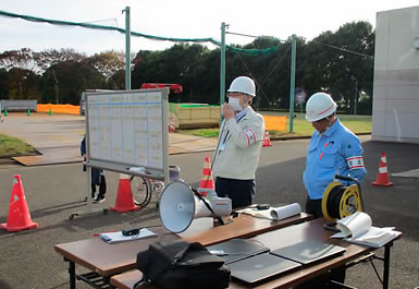 2009年6月1日の改正消防法の施行を踏まえ、消防訓練に防災の要素を取り込んだ防火・防災総合訓練を実施しています。2024年度は11月に地区毎に訓練(防火・防災訓練)を実施しました。地震の発生により火災や怪我人が発生したという内容の訓練シナリオで、初期消火訓練、避難誘導訓練、応急救護訓練、安全防護訓練、警備訓練を組み合わせ、総合訓練を行いました。