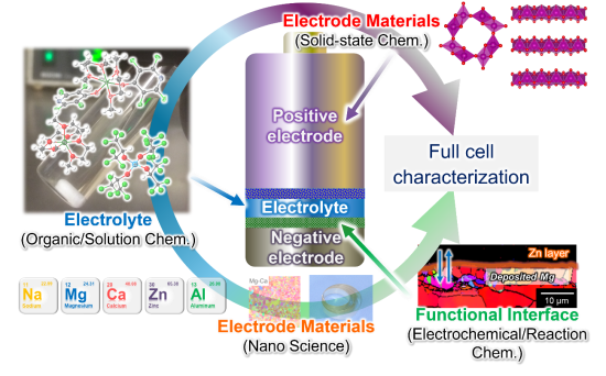 The Frontier Battery Materials Group focuses on such multivalent metal batteries, and is engaged in the design and development of electrodes, electrolytes, and their interfaces. By delaminating battery characteristics into their constituent elements from the perspectives of solution chemistry, structural chemistry, and solid-state chemistry, we establish design principles and realize promising materials for high-performant battery applications using organic, inorganic, and nanomaterial synthesis technologies.