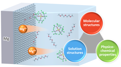 We are exploring new electrolytes for multivalent metal batteries utilizing Mg, which is inexpensive and safe. Our goal is to design and develop electrolyte salts suitable for Mg metal negative electrodes, and to reveal factors that control electrochemical properties through comprehensive analysis of molecular structures, solution structures, and physicochemical properties.