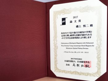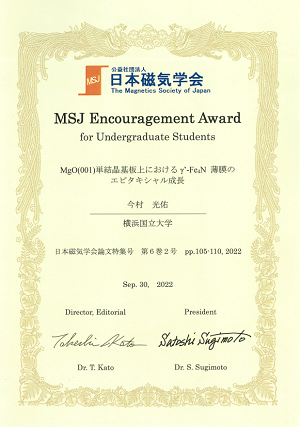 - 今村光佑氏(研修生・横国大)が日本磁気学会「MSJ論文奨励賞」を受賞しました。「MSJ論文奨励賞」とは「学生諸氏の論文投稿を奨励し、未来の研究者を育てたいとの思いで創設された賞」(日本磁気学会HPより)です。 受賞対象となった論文は下記の通りです。