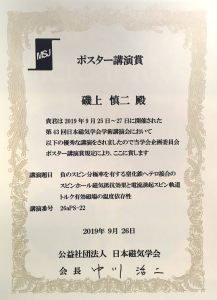 - 磯上慎二主任研究員が第43回日本磁気学会学術講演会(京都大学)にて「ポスター講演賞」を受賞しました。受賞対象となった講演タイトルは「負のスピン分極率を有する窒化鉄ヘテロ接合のスピンホール磁気抵抗効果と電流誘起スピン軌道トルク有効磁場の温度依存性」(講演番号26aPS-22)です。