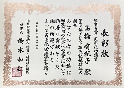 - 高橋有紀子グループリーダーがNIMS理事長賞「実用化功績賞」を受賞しました。受賞の功績は「FePt熱アシスト磁気記録媒体の開発」です。