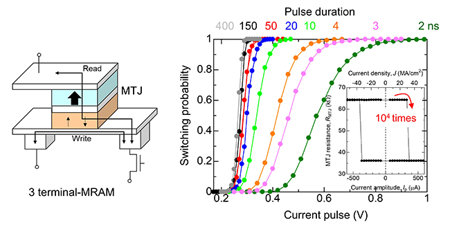 磁化の不揮発性、特有の積層素子構造によって超消費電力化、書込み耐性強化につながることから3端子固体磁気メモリは現行キャッシュメモリの代替デバイスとして期待され、実用研究が進んでいます。しかしその動作に外部磁場を必要とする点が問題の一つとされています。我々は、ホウ素・炭素・窒素といった侵入型軽元素イオンが持つ高い軌道混成効果や原子サイト自由度に着目した薄膜材料特性の開拓、あるいは積層素子構造や電流印加方式の工夫をもって解決に挑戦しています。