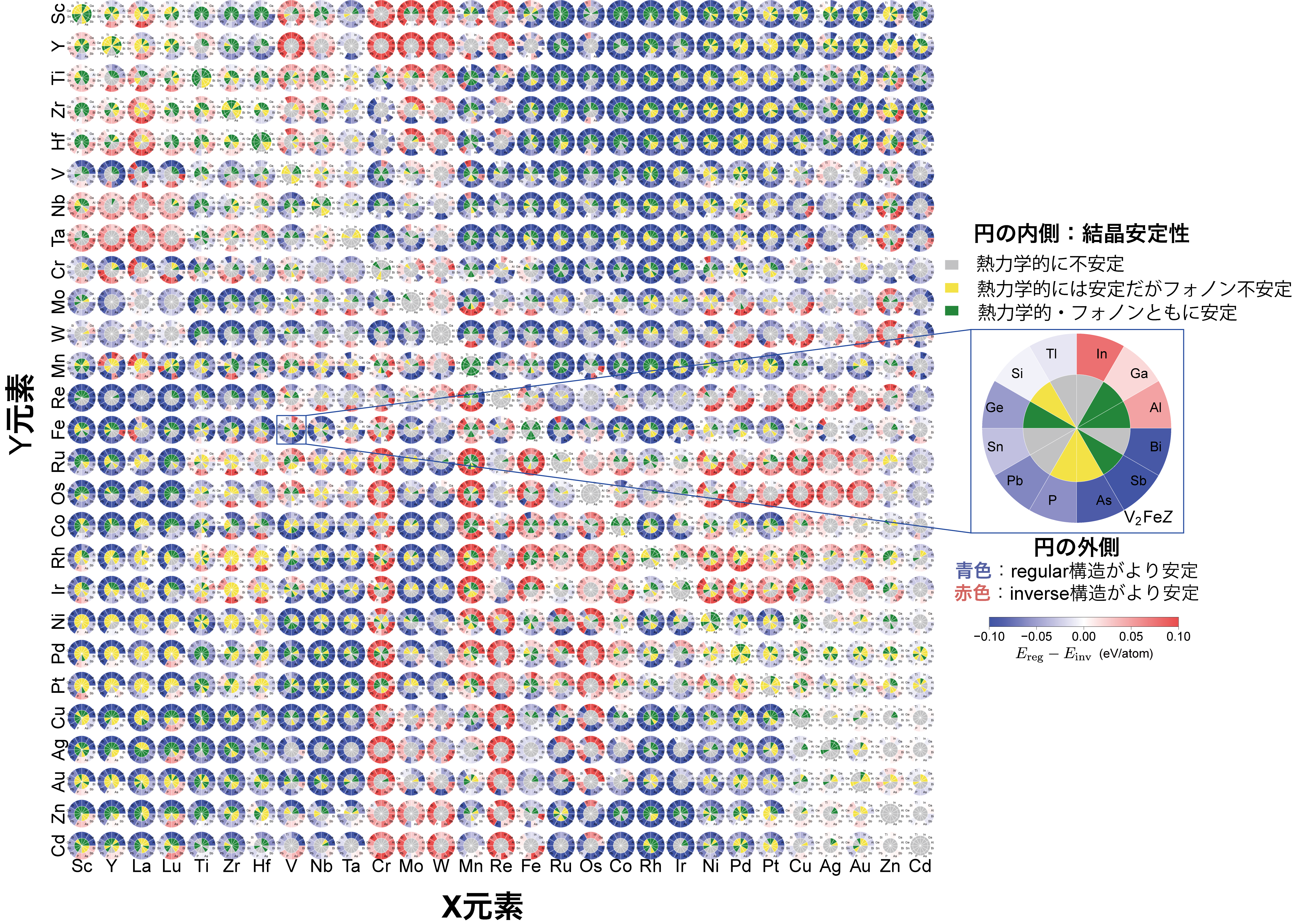 今回の網羅計算により、X2YZの組成を取る規則ホイスラー合金(regular構造もしくはinverse構造)はZ原子の第一イオン化エネルギーと原子半径が小さいほど安定性が高くなる傾向があることを示しました。一方、XYZの組成を取るハーフホイスラーではX原子の原子半径よりもY原子の原子半径が大きい事が重要であり、安定なハーフホイスラーの94%はこの条件を満たすことを明らかにしました。