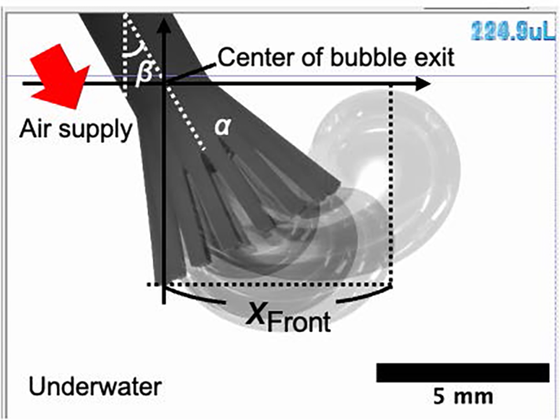 experimentally confirmed XFront as functions of α and β, indicating that XFront reaches maximum for α+β = 90 °. This indicates that the balance between bubble retention and forward motion is optimal for