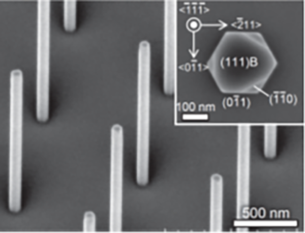 Semiconducting nanowires (NWs) have attracted great attention as a building block to improve the device performance associated with the miniaturization of transistors [1]. Our research aim is to develop a promising device architecture of the vertical NW gate-all-around (GAA) transistors, which utilize group III-V or IV semiconductor NWs as channel materials, as their shape with a large aspect ratio is suitable for creating the GAA-type structure of transistors. There are several methods reported so far to obtain vertical free-standing semiconductor NWs in the stie-controlled manner on a substrate. In the current study, therefore, we introduce our selective-area (i.e., site-controlled) growth methods for III-V and IV semiconductor NWs on semiconductor (111) substrates. The conventional and simple method for growing IV and III-V semiconductor NWs is the “vapor-liquid-solid (VLS)” method with a metal catalyst, in which “supersaturation” of source materials at the interface between a solid substrate and eutectic liquid nano-droplets is utilized as a driving force for crystal growth [1]. In the case of III-V semiconductor NWs, however, we can also use “faceting phenomenon” on the top and sidewall surfaces of NWs [2] as their growth rates are markedly different between crystal facet surfaces, which depend on the partial pressure of group V source gas and growth temperature [2-5]. This “faceting growth” enables us to realize the “selective-area (or, site-controlled) growth” of III-V semiconductor NWs (Fig. 1) without any use of metal catalysts, using the periodic array of circular openings formed by electron beam lithography and etching in the growth-inhibiting dielectric SiO2 films deposited on a substrate.