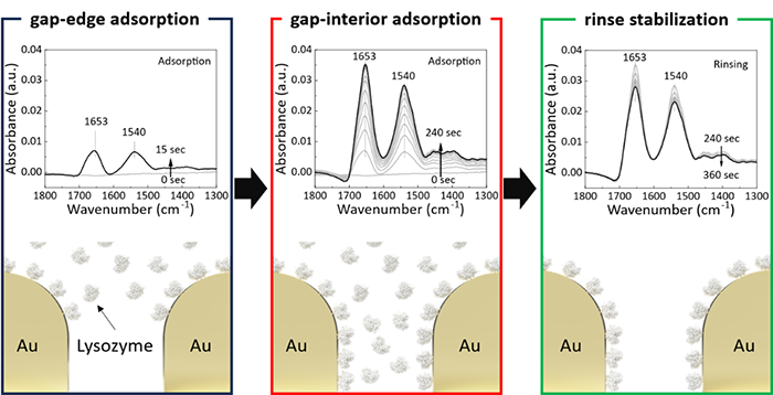 Understanding protein adsorption at solid-liquid interfaces is essential for advancing biosensing, biomaterials, and biocatalysis. In this study, we present a polarization-resolved attenuated total reflection surface-enhanced infrared absorption spectroscopy (ATR-SEIRA) platform utilizing gold near-percolated optimized structure. Using hen egg white lysozyme as a model, in situ ATR-SEIRA spectra with s-polarized light revealed three distinct adsorption stages—gap-edge adsorption, gap-interior adsorption, and rinse stabilization—each characterized by dynamic changes in the amide I/II intensity ratio. Post-rinse spectral deconvolution of the s-polarized amide I band revealed secondary structure changes: a 4.8% decrease in α-helix, a 9.7% reduction in random coil, and increases of 2.3% in β-sheet and 12.2% in β-turn content. These results highlight that the nanogap-enhanced SEIRA platform provides a highly sensitive and structurally informative tool to investigate protein adsorption and conformational dynamics under physiologically relevant conditions.