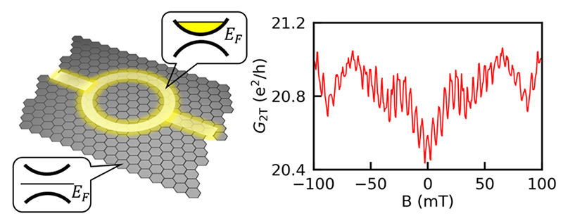 Figure 1: Left: Schematic image of the gate-defined ring in bilayer graphene. The ring-shaped area is conductive while the rest of the sample is tuned into the insulating state. Right: Magneto-conductance trace through the ring showing Aharonov-Bohm oscillations.