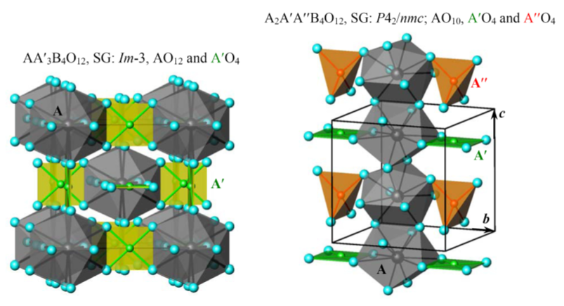 In the last years, we explored another special class of perovskite materials with the general composition of A2A’A’’B4O12 (Figure 1 (right))