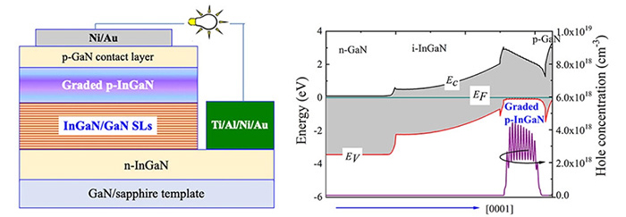 (left)Schematic structure, (right)Simulated energy band diagrams and hole distribution profiles for solar cell with In composition graded p-InGaN.