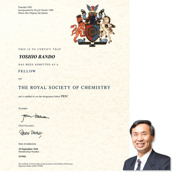 英国王立化学会フェロー証明書と板東義雄 MANA最高運営責任者