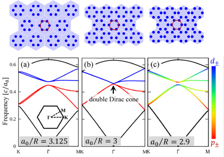 上段:蜂の巣格子に並んだ円柱からなるフォトニック結晶を上からみた場合の模式図。最隣接した円柱を六角形クラスターに区分けしたうえ、形状とサイズを一 定にしたまま、六角形クラスター同士の間隔を、蜂の巣格子(中列)から、伸ばした場合(左列)と縮めた場合(右列)に得られるフォトニック結晶。下段:そ れぞれの場合に対応するフォトニック結晶の波数と周波数の関係。但し、a0は六角形の中心から計った六角形クラスター間の距離で、Rは六角形の一辺の長さである。