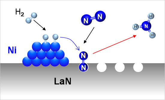 プレスリリース中の図 : Ni担持LaNでのアンモニア合成の機構。キーとなる窒素分子の活性化を窒素欠陥が担っており、ニッケルは水素の解離のみを行う。