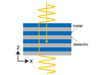 Materials scientists can produce sub-wavelength artificial structures (split rings, honeycomb shapes and many more) to interact with electromagnetic waves so that the propagation of waves can be arbitrarily controlled to achieve desired effects. Among the myriad of these ‘metamaterials’, metal-dielectric periodic multilayers--hyperbolic metamaterials (HMMs)--are of particular interest. In spite of their simple structure, HMMs have the potential for unique optical applications including super-resolution lens, sub-wavelength interference and enhancing the emission of single-photon sources.