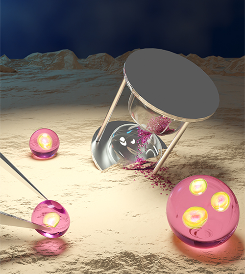 超撥水技術を活用して作製したドライセル、粉体のように流動するマイクロ液滴には、生きた単細胞が封入されている。ドライセルは細胞懸濁液をマイクロ液滴化し、超撥水性ナノ粒子で被覆することで形成される。超撥水粒子が液滴同士の癒合を防ぐことで、ドライセルは水分量>95%でありながら、乾燥粉末(水分率<0.01%相当)と同等の流動性を示す。プロセスパラメーターを調整することで1ドライセルあたりの細胞内包量を制御することも可能である。更には、1ドライセル中に正常細胞とがん細胞を1個ずつ封入したり、細胞のコロニーを複数封入したりもできる。