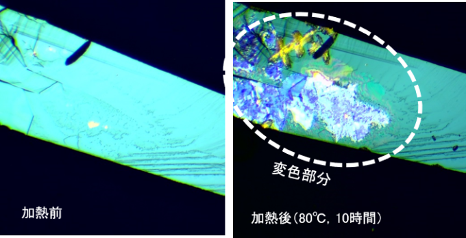 本研究では感度の高い磁場変調法を用い(図2)、圧力下での交流磁化率測定を行った。α-(BEDT-TTF)2I3は加圧に伴って電荷秩序相-有限質量のディラック相-質量ゼロのディラック相へと変化するが、これまでの研究によりすべての相において反磁性が観測され、予測に反する結果が得られていた。最近になって本物質は70℃以上で数10時間アニールすることにより、超伝導を示すβ-(BEDT-TTF)2I3 (以降β型) に構造が変化し得ることが分かった。実際に試料を加熱して偏光顕微鏡像を観察し、試料の一部において構造転移に関連すると考えられる変色が見られることを確認した(図3)。反磁性が観測される温度・磁場・圧力領域もβ型の超伝導相とほぼ一致することから、今まで観測されていた反磁性の起源はβ型の超伝導に由来する可能性が高い。アニール温度は室温と比べてそれ程高くないことから、経年変化によって試料の一部で構造変化が引き起こされたのではないかと考えられる。