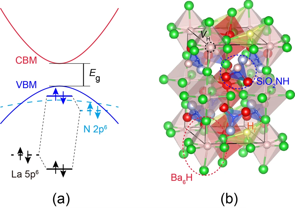 (a) Schematic electronic structure of LaN. (b) Crystal structure of Ba3SiO2.5NH2.