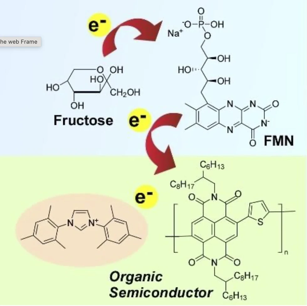 Doping process with electron transfer from the fructose to the FMN, and then from the FMN to the organic semiconductor thin films.