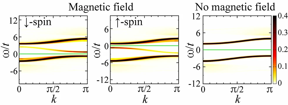 The highlight of our research in FY2025 is the theoretical elucidation of how and why electronic modes can be induced in strongly correlated insulators by various spin and charge perturbations such as magnetic field and light irradiation, which in turn alter the band structures (Fig. 1) [ 1 ]. The validity and generality across different models and dimensions are demonstrated using numerical calculations. The findings of this study provide basic principles for band-structure engineering in strongly correlated insulators, beyond the conventional framework of rigid-band-based electronics.