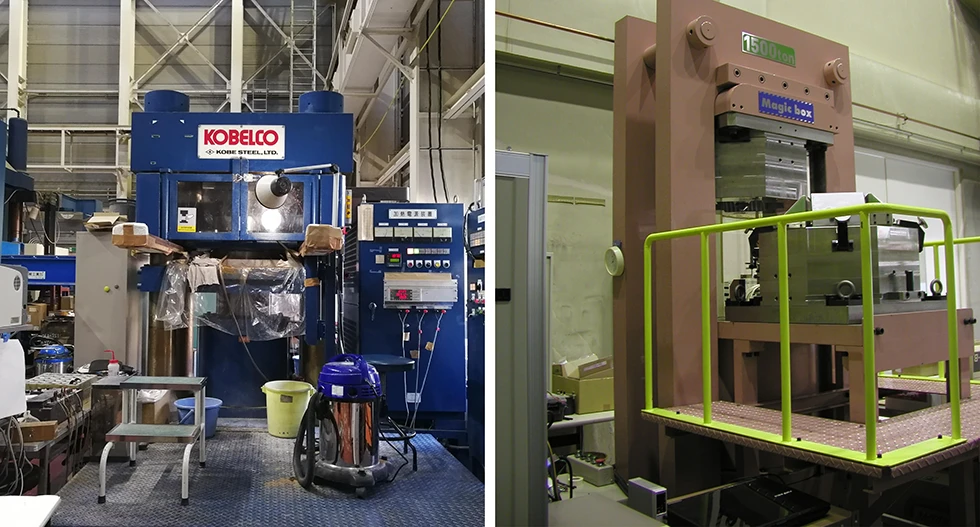Belt-type (left) and multi-anvil-type (right) high-temperature high-pressure apparatuses used for crystal growth and the exploration of new materials.