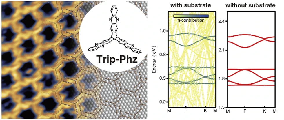 We have shown that the application of a triptycene derivative with phenazine moieties, Trip-Phz, solves this problem due to its strong intermolecular π–π pancake bonding and nonplanar geometry. Our scanning tunneling microscopy (STM) measurements demonstrate that Trip-Phz molecules self-assemble on a Ag(111) surface to form chiral and commensurate honeycomb lattices [ 1 ]. Electronically, the network can be viewed as a hybrid of honeycomb and kagome lattices. The Dirac and flat bands predicted by a simple tight-binding model are reproduced by total density functional theory (DFT) calculations.