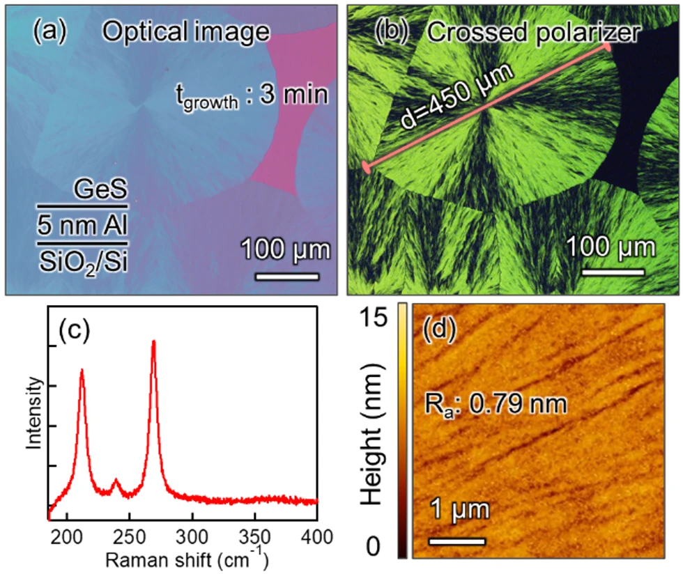 Without a metal catalyst, crystal growth exhibited a square shape reflecting the GeS crystal structure. However, on the Al catalyst, crystal growth spread out into a circular shape. This can be attributed to the catalytic effect of Al accelerating the growth rate, causing crystallization to proceed radially outward from the nucleation site. Currently, we are exploring growth conditions that enable the realization of single-crystal growth with fewer defects by further controlling the crystal growth rate.
