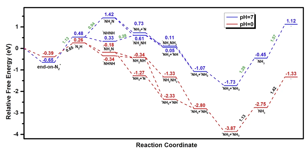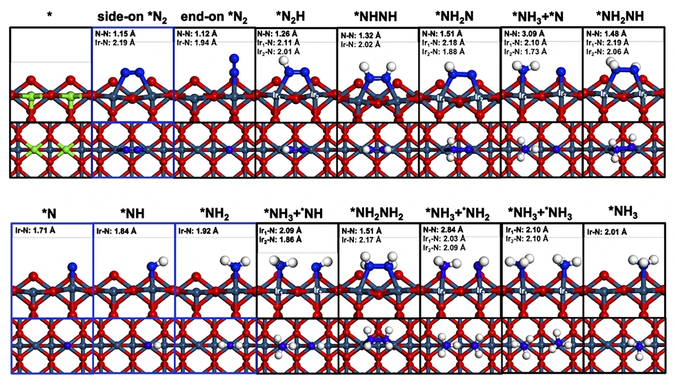 (Upper) Free energy diagram for nitrogen reduction reaction (NRR) on IrO2 (110) surface with RISM solvation model. The pathways under water (pH = 7) and acid (pH = 0) solvation are depicted in blue and red lines, respectively. (Lower) Side and top views of the atomic structures in the NRR process.
