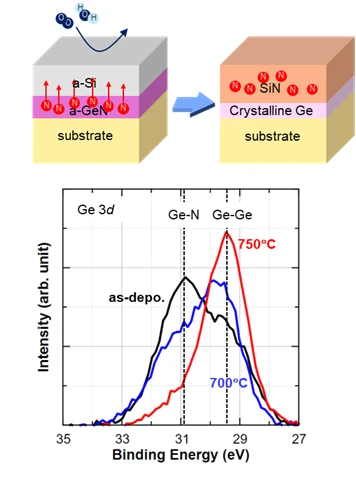 It has been reported that vacuum annealing of plasma‑nitrided GeN/Ge structures induces selective nitrogen desorption and recrystallization of Ge [ 2 ]. Based on this insight, we explore a novel method for forming Ge nanosheets. A stacked structure consisting of a GeN film and an Si capping layer was fabricated on a sapphire substrate, and Ge nanosheet formation was achieved by driving nitrogen atoms from the GeN layer into the Si capping layer through vacuum annealing (Fig. 1). This achievement opens a pathway toward the fabrication of ultrathin, high‑quality Ge nanosheets.